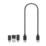 Mitmeotstarbeline 3-in-1 laadimis- ja andmeedastuskaabel erinevate ühendustega, esitatud akaatsiapuidust karbis
