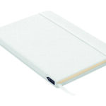 A5 märkmik kõva 600D RPET kaanega. Köidetud. 160 joonelist lehte taaskasutatud paberist (80 lehte). Sobiv elastne kinnitusrihm ja järjehoidjalint. FSC®-sertifikaadiga | FSC MIX CREDIT, P7.1, FSC-C213206.