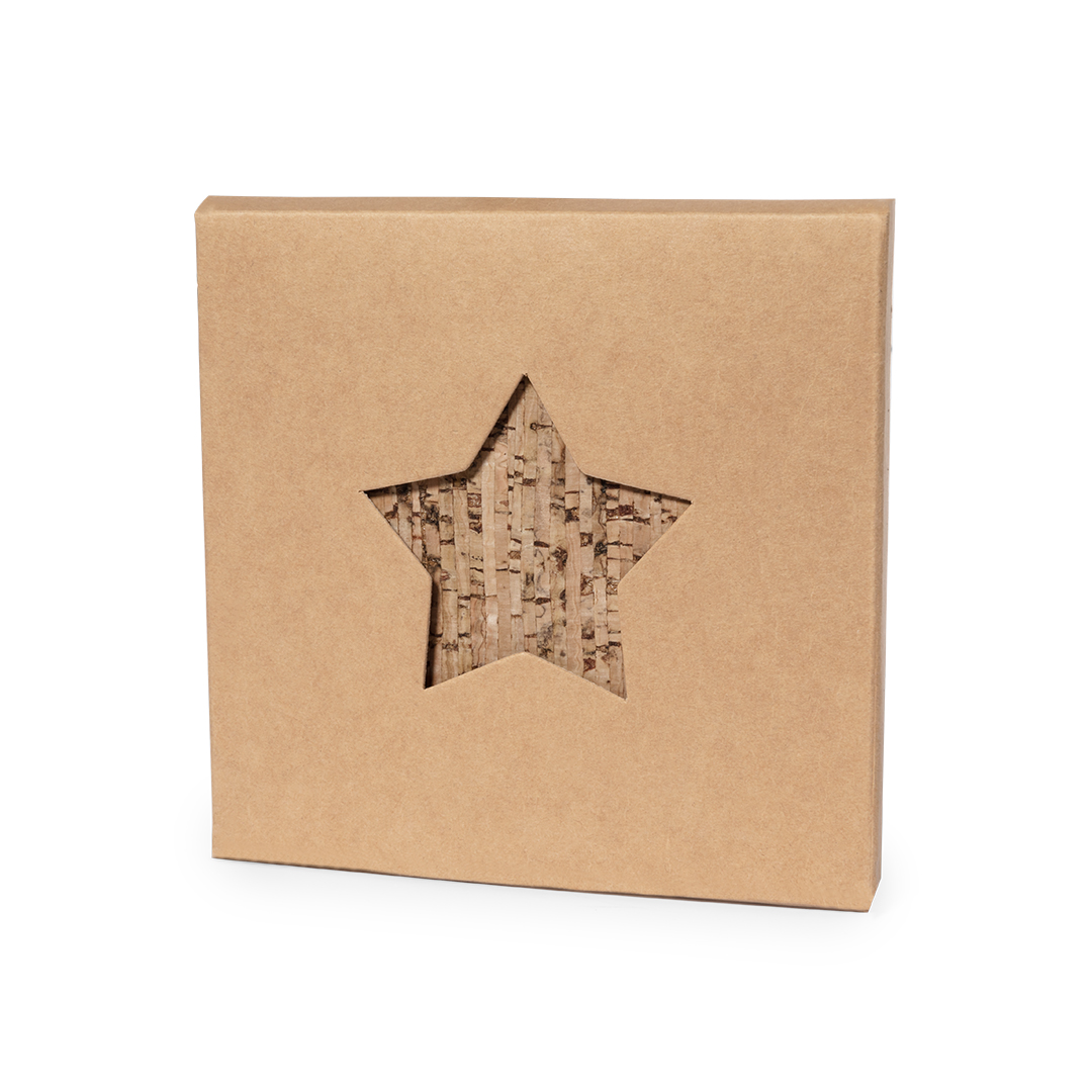 4-osaline joogialuste komplekt, valmistatud looduslikust korgist. Iga aluse kuju on täht ja komplekt on pakitud stiilsesse kraftpaberkarpi, millel on lõigatud tähekujundus. Valmistatud taimsetest elementidest, et toetada looduslike toorainete kasutamist ja vähendada keskkonnasõbraliku tootmise mõju. Ideaalne kingitus või elegantne lisand jõuluajaks kodus või kontoris