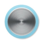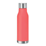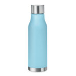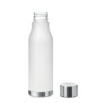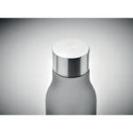 Drinking bottle in RPET with rubberised finish (frosted transparent) and stainless steel cap with inner RPET lid and silicone ring. BPA free. Leak-free. Capacity: 600 ml. Not suitable for carbonated drinks.