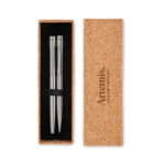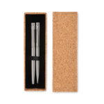 Ringlussevõetud roostevabast terasest kirjutuskomplekt, kuhu kuulub pastapliiats ja tindipliiats. Pakendatud kaunisse korgist karpi. Valikus on sinine ja must tint