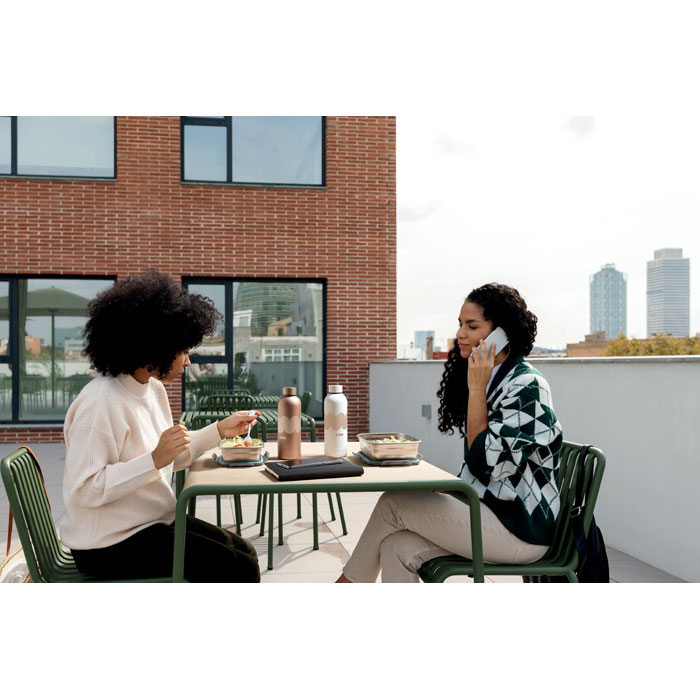 Taaskasutatud roostevabast terasest lõunasöögikarp taaskasutatud PP kaanega ja 4 küljekinnitusega. Mahutavus: 850 ml