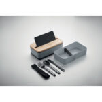 Taaskasutatud PP-st kahekorruseline lõunakarp, millel on eemaldatav jaotur, 3 söögiriista ning polüsterpaelaga kinnitatav bambusest kaas. Kaanel on telefonialuse funktsionaalsus. Mahutavus: 400 ml (2x). Bambus on looduslik toode, ühe eseme värvis ja suuruses võib esineda väikesi erinevusi, mis võivad mõjutada lõppviimistlust