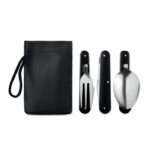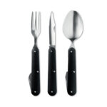 3 SERVICE on telkimisnõude komplekt, mis sisaldab lusikat, kahvlit ja nuga kombineerituna ühes. Tarvikud on valmistatud roostevabast terasest ja alumiiniumist käepidemega, tagades vastupidavuse ja pika kasutusea. Komplekt on pakitud musta kotikesse, mis hoiab tarvikud korras ja lihtsasti kaasaskantavana. Kompaktne ja kerge disain teeb komplekti mugavaks kasutada nii matkadel kui ka telkimisel. Materjalid on vastupidavad ja kergesti puhastatavad. Kotile või tarvikutele on võimalik lisada logotrükk. 3 SERVICE sobib ärikingitusena ja ka jõulukingitusena. See on praktiline ja mitmekülgne lahendus välitegevusteks