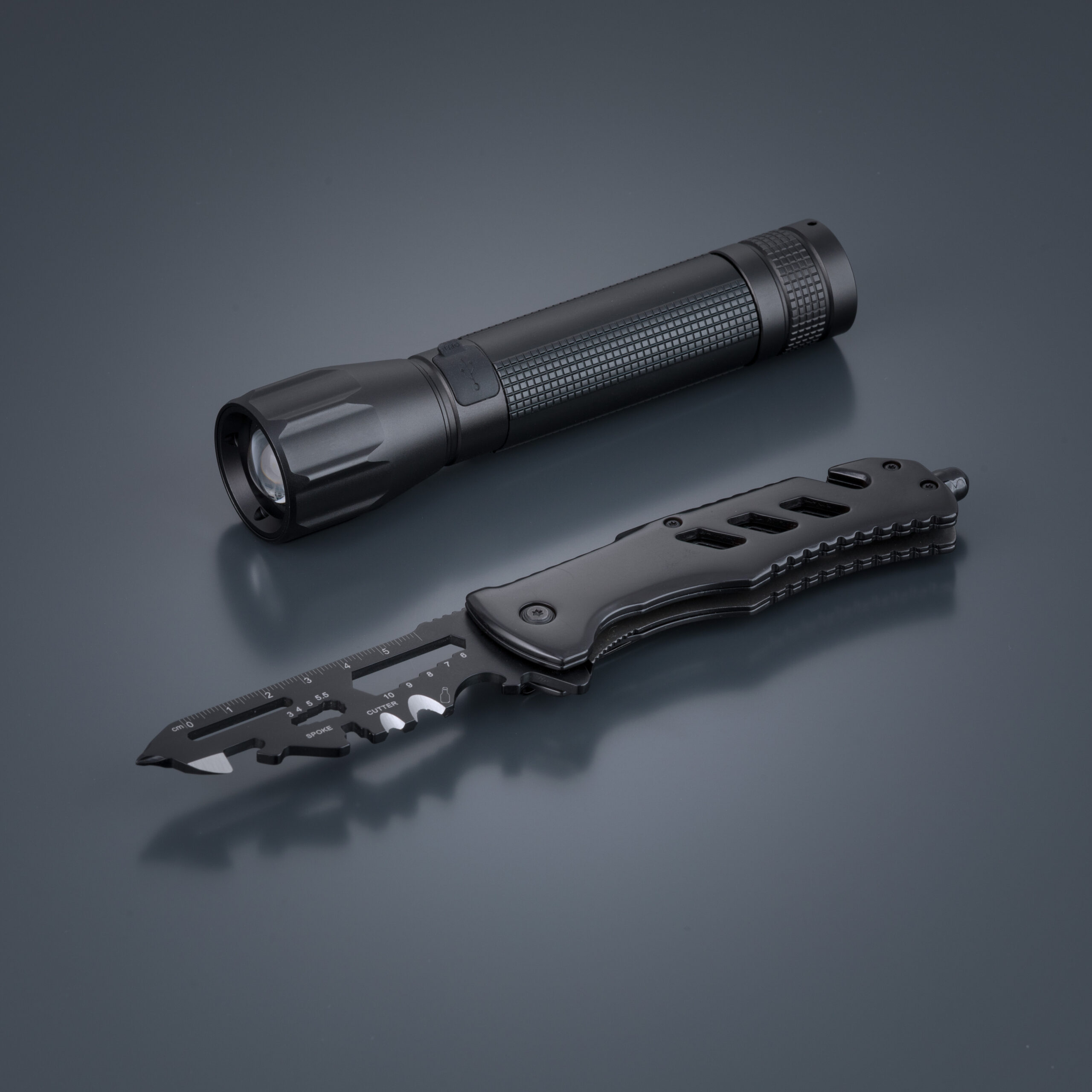 Kompaktne ja vastupidav multitööriist sisaldab lõiketera, joonlauda, turvavöö lõikurit, liblikvõtit, kuuskantvõtmeid (4–10 mm), klaasipurustit ja konserviavajat – koondades olulised tööriistad kergesse disaini. Võimas taskulamp on valmistatud tugevast alumiiniumist, on IP64 veekindlusega, reguleeritava suumkiirega (kuni 200 m) ning viie valgusrežiimiga.