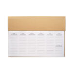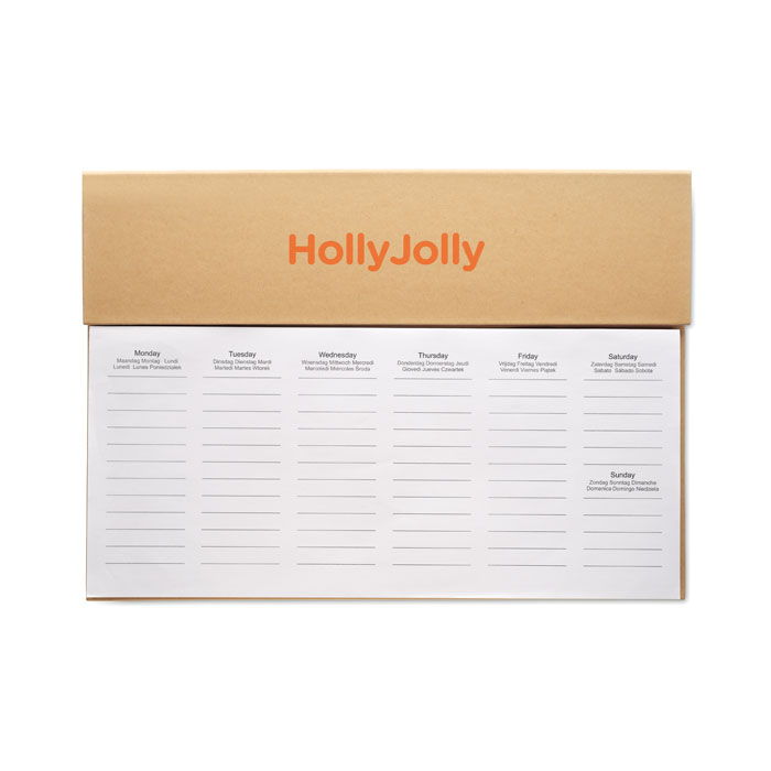 125-leheküljeline nädalaplaanimisraamat, 6 keeles, kraftpaberköites. Komplektis pliiats, puidust joonlaud ja memopaber