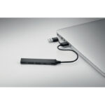 4 pordiga taaskasutatud alumiiniumist USB-jaotur. 3 USB-A + 1 tüüpi C. Sisend: 2-in-1 Type-C & Type-A. Kaabli pikkus: 19 cm