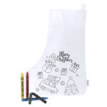 Valgest RPET-materjalist jõulusokk lõbusate pühadejoonistustega, mida saab värvida. Komplektis 5 värvipliiatsit ja riputusriba