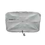 Windshield sun shade car umbrella in 190T pongee with 1 side silver lining. Manual open/close.