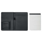 A5 portfolio in 2 tone 300D RPET. Replaceable A5 notepad. 40 white lined bamboo paper pages (20 sheets). Pen holder. Cardholders inner side and one big compartment.