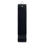 Cotton golf towel with a copper hole and ring on top that can be used as a hanger. 350 gr/m². Towel size: 40×60 cm.