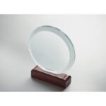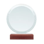 Round crystal award or memorial plaque on a beech wooden base in a gift box.