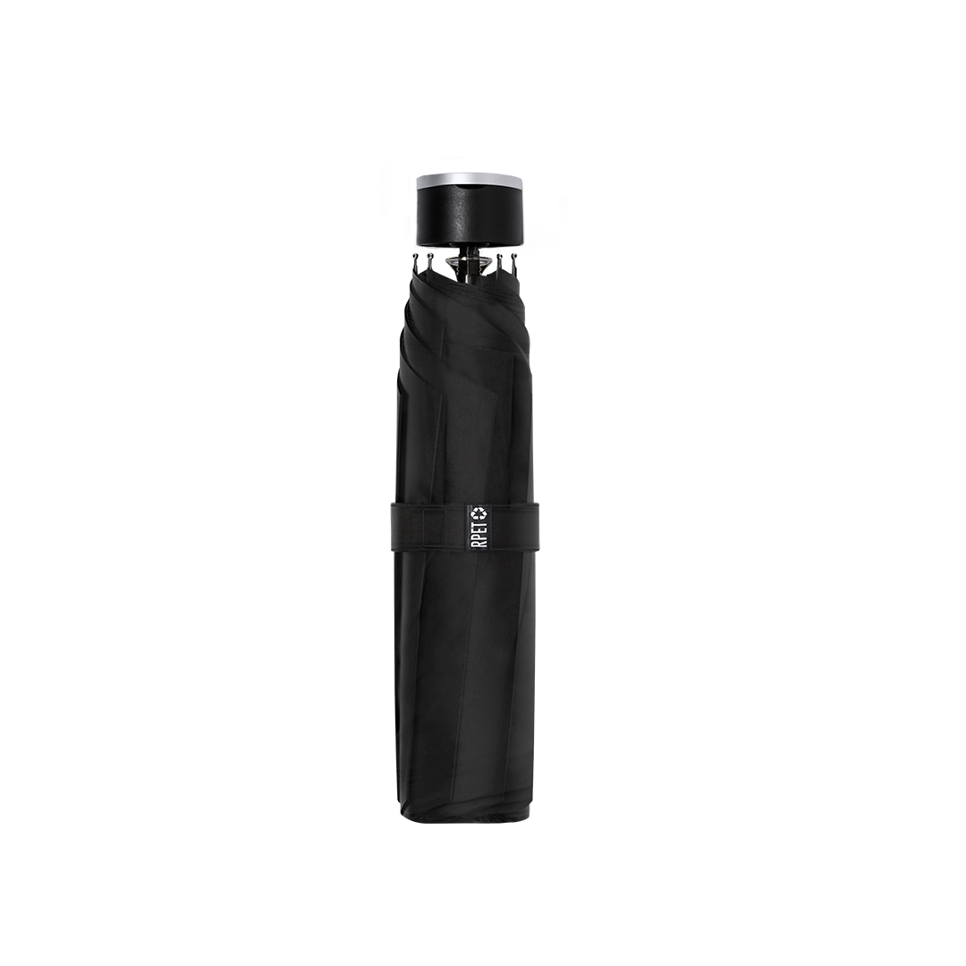 Kokkupandav vihmavari, läbimõõduga 98 cm, musta värvi, valmistatud 190T RPET-pongee materjalist. Käsitsi avatav, tuulekindla mehhanismi ja klaaskiust ribidega. Kompaktne vutlar ja kanderihmad. RPET-silt rõhutab materjali keskkonnasõbralikku päritolu.