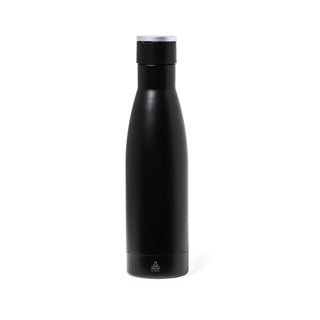 Termospudel 500 ml, valmistatud taaskasutatud roostevabast terasest, kahekihilise isolatsiooniga, mati musta viimistlusega. Hõbedane metallist käepide ja roostevabast terasest silt.