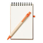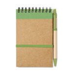Korgist kaanega taastöödeldud paberist valmistatud 70 leheküljega A6 märkmik. Komplektis taastöödeldud papist ja maisist valmistatud PLA-plastist detailidega musta tindiga pastapliiats