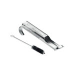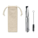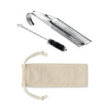 Re-usable Stainless steel pipe tea infuser set in cotton pouch. Includes tea filter with compact and curved hooked to allow it to hang over the edge of the cup or mug and cleaner brush.