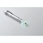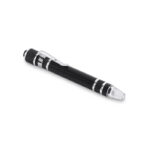 Recycled aluminium multi tool in pen shape with torch. Includes 3 slotted and 3 Phillips screwdriver heads. 4 button cell LR41 batteries included.