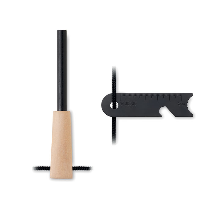 Komplekt sisaldab tuletegemise pulka ja mitmeotstarbelist roostevabast terasest kraapimisriista, mis on mõeldud kasutamiseks koos tuletegemise pulgaga. Lisaks on komplektis pudeliavaja, täpne joonlaud ja kuuskantvõti. Männipuust ja roostevabast terasest valmistatud tööriistad on vastupidavad ja kasulikud igale matkahuvilisele