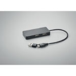 Alumiiniumist korpusega USB-jaotur. Väljund: 2 x Type-A ja 1 x Type-C. Sisend: 2-in-1 Type-C & Type-A. Kaabli pikkus: 20 cm