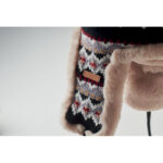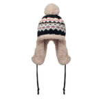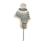 Knitted beanie with ear flaps and pompom in acrylic fibre with polyester and fleece lined. Includes label for printing area on one side. Adult size.