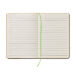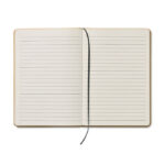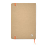 Kvaliteetne A5 märkmik taaskasutatud kartongkaanega ja 160 joonelise ümbertöödeldud paberilehega. Elastne sulgurihm ja järjehoidja