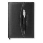 Stiilne PU-kaantega märkmik kontrastõmblusega ja metallist pastapliiatsiga. 240 joonega lehte (120 lehekülge). Must tindiga pastapliiats komplektis