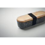 RPET vildist pliiatsikarp, millel on bambusest kaas ja integreeritud telefonihoidik. Joonlaud: 5,5 tolli ja 13,5 cm. Elastne sulgemisrihm