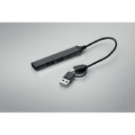 4 pordiga taaskasutatud alumiiniumist USB-jaotur. 3 USB-A + 1 tüüpi C. Sisend: 2-in-1 Type-C & Type-A. Kaabli pikkus: 19 cm