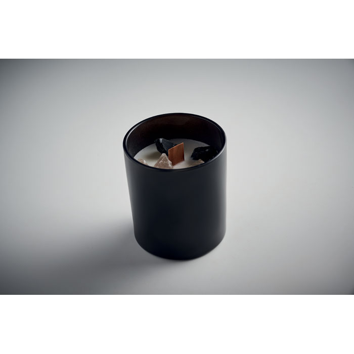 Vanillilõhnaline taimevahast küünal kividega klaasis, 200 g, puidust taht, põlemisaeg kuni 20 h